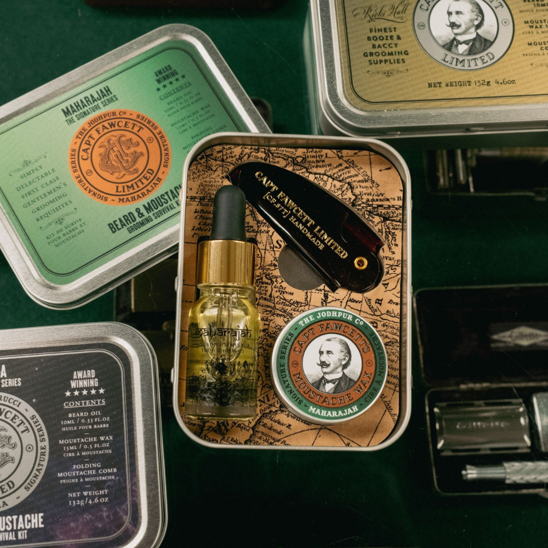 La série Maharajah du Captain Fawcett est parfaite pour prendre soin de soi jusqu'au bout des poils. Découvre dès maintenant le kit complet pour barbe et moustache.
